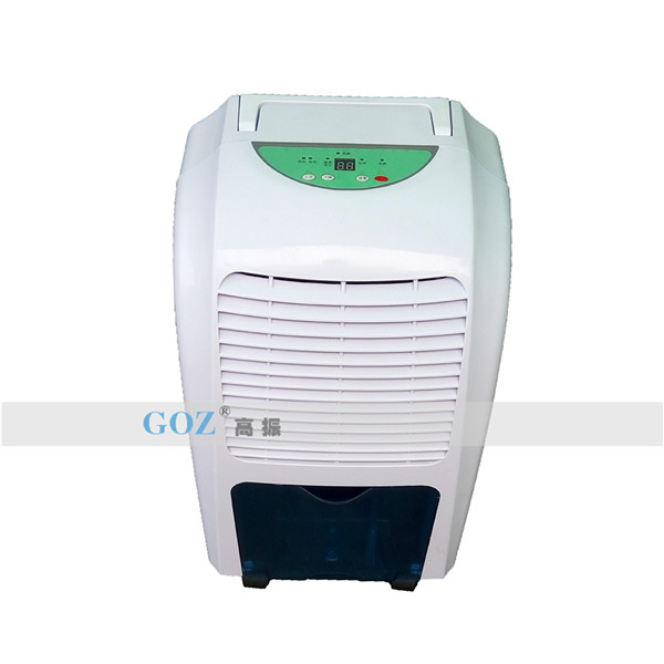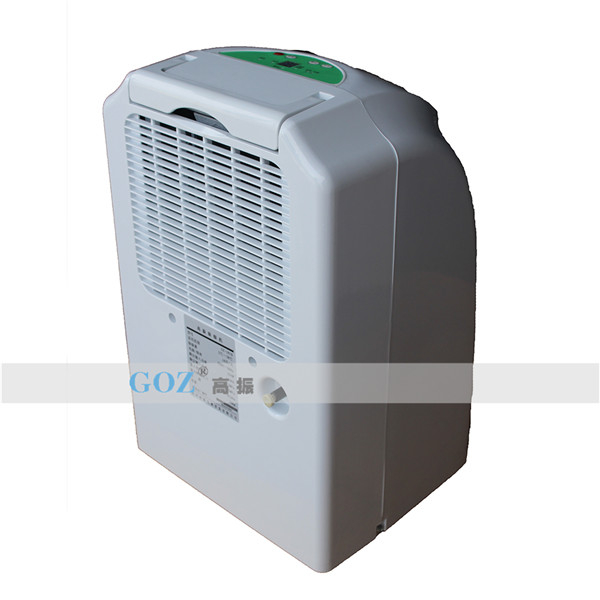 高振商用除濕機(jī)通過風(fēng)機(jī)將潮濕空氣抽入機(jī)器內(nèi)部,通過壓縮機(jī)制冷將蒸發(fā)器降溫至露點(diǎn)以下,潮濕空氣經(jīng)過蒸發(fā)器在表面凝結(jié)成水,匯集至接水盤后,流入水箱中,干爽空氣經(jīng)冷凝器重新加熱由出風(fēng)口排出,這樣不斷循環(huán)將室內(nèi)濕度降低。