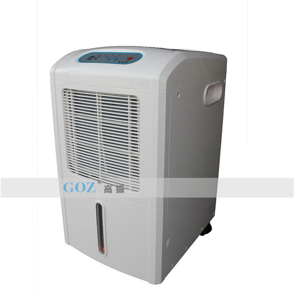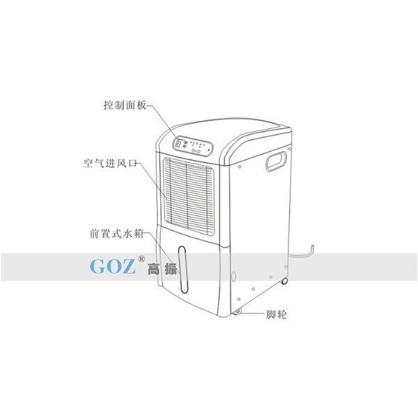 高振商用除濕機(jī)通過風(fēng)機(jī)將潮濕空氣抽入機(jī)器內(nèi)部,通過壓縮機(jī)制冷將蒸發(fā)器降溫至露點(diǎn)以下,潮濕空氣經(jīng)過蒸發(fā)器在表面凝結(jié)成水,匯集至接水盤后,流入水箱中,干爽空氣經(jīng)冷凝器重新加熱由出風(fēng)口排出,這樣不斷循環(huán)將室內(nèi)濕度降低。