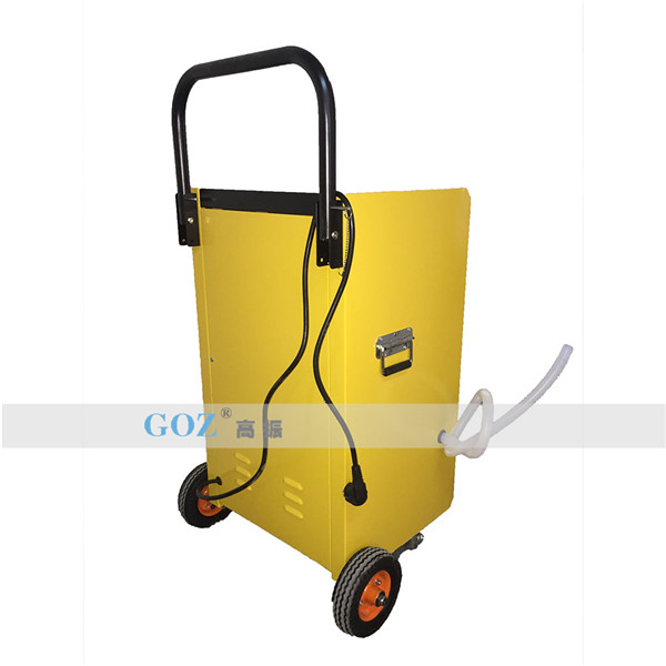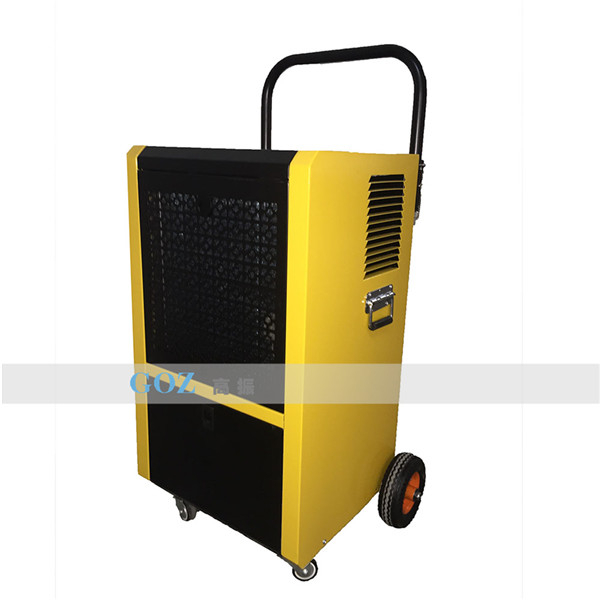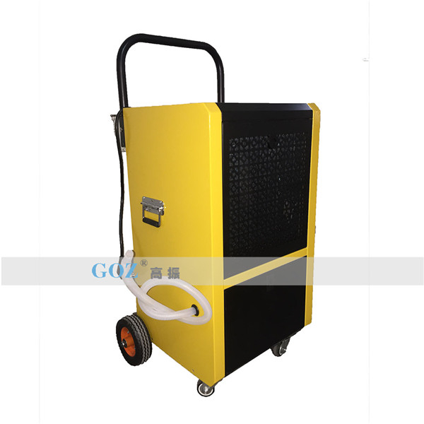 高振手推車除濕機(jī)通過風(fēng)機(jī)將潮濕空氣抽入機(jī)器內(nèi)部,通過壓縮機(jī)制冷將蒸發(fā)器降溫至露點(diǎn)以下,潮濕空氣經(jīng)過蒸發(fā)器在表面凝結(jié)成水,匯集至接水盤后,流入水箱中,干爽空氣經(jīng)冷凝器重新加熱由出風(fēng)口排出,這樣不斷循環(huán)將室內(nèi)濕度降低。
